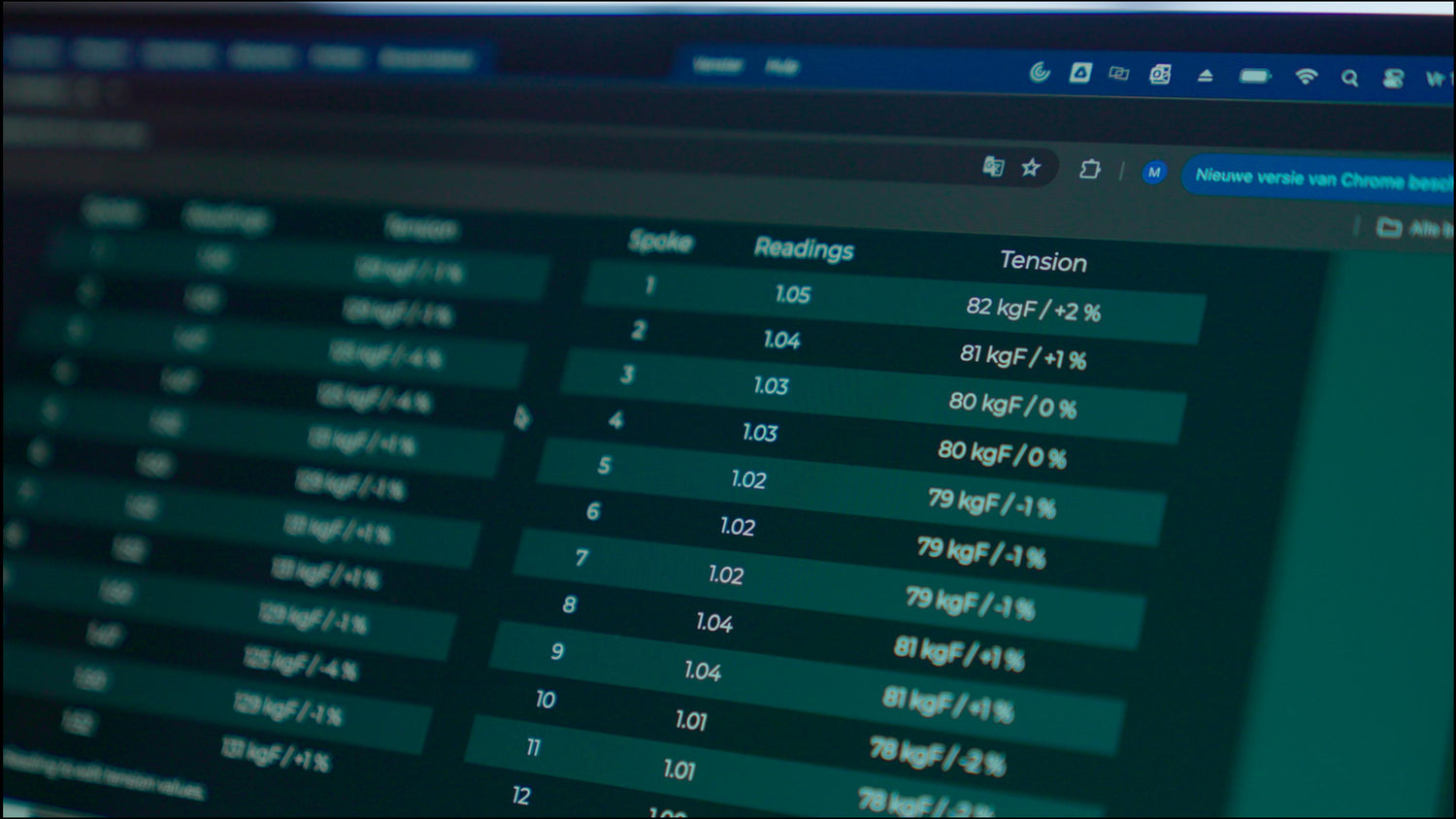 Elk wiel wordt met uiterste zorg handgebouwd in onze werkplaats door Thomas en Menno. We gebruiken hoogwaardige gereedschappen en meetapparatuur, waaronder een ontstressmachine, om de duurzaamheid en prestaties van elk wiel te optimaliseren. Bij elk wiel leveren we een kwaliteitsdocument, waarin alle spaakspanningen en de variatie daarin nauwkeurig zijn gedocumenteerd. Zo weet je precies dat jouw wiel voldoet aan de hoogste normen. Strikte kwaliteitscontrole en afwerking zorgen ervoor dat je wiel zowel op papier als in de praktijk perfect presteert. - Ophalen & ervaren